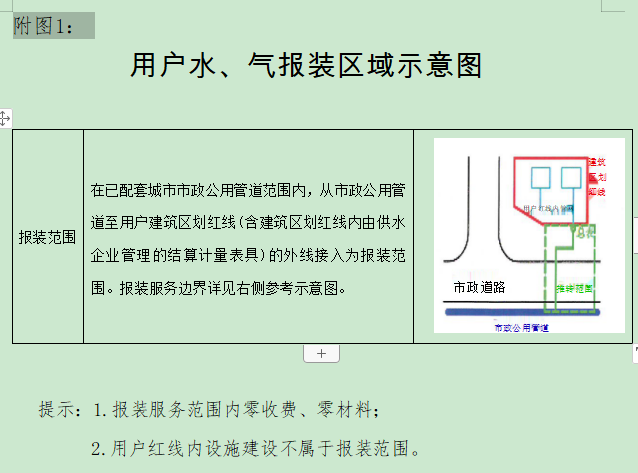 在已配套城市市政公用管道范圍內(nèi),從市政公用管道至用戶(hù)建筑區(qū)劃紅線(xiàn)的外線(xiàn)接入為報(bào)裝范圍。供水、供氣企業(yè)的投資界面必須延伸至用戶(hù)建筑區(qū)劃紅線(xiàn),紅線(xiàn)外連接工程由供水、供氣企業(yè)負(fù)責(zé),用戶(hù)“零成本”不需要投資。施工結(jié)束后,供水、供氣企業(yè)按指定標(biāo)準(zhǔn)恢復(fù)市政道路和園林綠化。