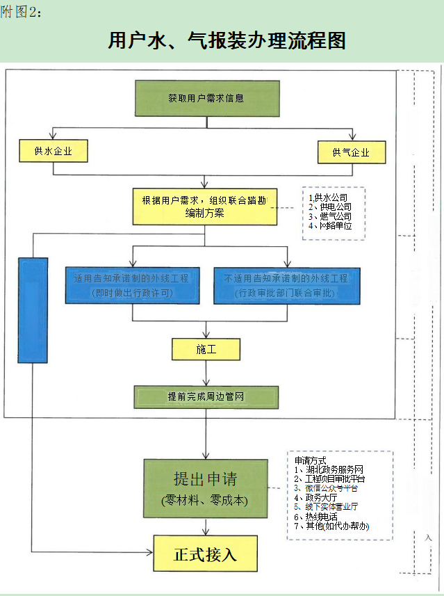 (一)免費(fèi)申請(qǐng)。 用戶(hù)通過(guò)政務(wù)服務(wù)網(wǎng)、供水供氣網(wǎng)上營(yíng)業(yè)廳、微信公眾號(hào)、各營(yíng)業(yè)網(wǎng)點(diǎn)等方式提出用水用氣接入申請(qǐng)。