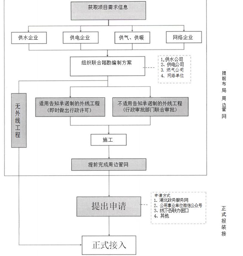 (二) 一表申請減材料。 突破各公用事業(yè)單位各自獨(dú)立報(bào) 裝的運(yùn)作模式,將報(bào)裝用戶分頭多次申請整合為一并申請。將 用水、用電、用氣、用網(wǎng)的報(bào)裝需求表,統(tǒng)一整合為《用戶獲 得水、電、氣、網(wǎng)、暖需求信息采集單》。同時(shí),進(jìn)一步精簡 各公用事業(yè)單位和行政審批部門要求提供的受理材料,并借助 湖北政務(wù)服務(wù)網(wǎng)“工改平臺、電子證照庫、批復(fù)文件庫”等,實(shí)現(xiàn)政企之間材料的互通共用。